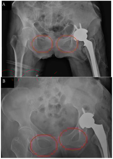 - Polesello, G.C.; Nakao, T.S.; Queiroz, M.C.D.; Daniachi, D.; Ricioli Junior, W.; Guimarães, R.P.; Honda, E.K. Proposal for standardization of radiographic studies on the hip and pelvis. Rev. Bras. Ortop. 2011, 46, 634–642. [Google Scholar] [CrossRef] [PubMed]