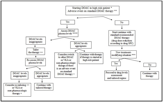 A proposed scheme for tailored direct oral anticoagulation. DOAC—direct oral anticoagulants; INR—international normalized ratio; LC-MS—liquid chromatography-mass spectrometry; SPC—summary of product characteristics; VKA—vitamin K antagonists. * severe renal/hepatic function impairment, extremely high body weight, advanced age, drug interactions. ** embolic stroke/systemic embolism or bleeding on labeled DOAC therapy. *** new adverse bleeding or thrombosis, new decrease in renal/hepatic function, new possible drug interaction, questionable patient drug compliance. **** LC-MS (if available) or drug-specific coagulation assays; test for trough (pre-drug dose) and peak (post-drug dose) levels. + VKA with target INR 2-3 or left atrial appendage (surgical/transcatheter) occlusion. ++ by optimizing drug dose or switch strategy or by modification of (modifiable) factors influencing DOAC drug levels.