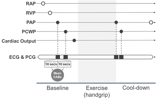 Right heart catheterization was performed using a 6-French triple lumen Swan-Ganz catheter through the internal jugular or femoral vein under ultrasound guidance. The workflow of catheterization with simultaneous ECG and phonocardiogram (PCG) recording is shown in Figure 1. Baseline measurements included right arterial pressure, right ventricular pressure, PAP, pulmonary capillary wedge pressure (PCWP), and cardiac output at rest. PCWP was recorded with a Swan-Ganz catheter brought into the inferior lobar branch of the right pulmonary artery and wedged with dilated balloon. Handgrip was performed after baseline measurement. Patients were asked to squeeze a cylindrical grip at about 75% maximal voluntary handgrip contraction until exhaustion or the occurrence of some symptoms. They were further instructed to keep breathing to avoid Valsalva load. PAP and PCWP were measured near the end of the handgrip which may have been maximal load. After the exercise, post-exercise (cool-down) PAP was recorded. Cardiac output was calculated using the Fick method with the baseline mixed venous and artery oxygen saturation, and the cardiac index was calculated by standardizing cardiac output with the body surface area. Only cardiac index at baseline and PAP and PCWP at baseline and after exercise were used in the analysis in this report, and they are indicated as filled circles in Figure 1.