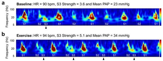 The three categories of CABs other than strength were geometrically derived as follows: Intensity, peak-to-peak amplitude on PCG inside the segments of heart sounds; Width, time duration on PCG inside the segments of heart sounds; and Complexity, the total areas of valleys created by the peaks in high-frequency components inside the segment. Strength is an exclusive category for abnormal heart sounds, S3 and S4. It is a probability score based on acoustic features reflecting the presence of an S3 and S4 for each recording. The parameter ranged from 0 to 10, and values above five indicated the existence of a clinically audible and persistent S3 or S4 in a 10-second recording. The scalograms in Figure 2 are visual descriptions of the change in S3 and of the corresponding S3 Strength in relation to hemodynamic stress caused by handgrip. S3 is usually subaudible (with a frequency below 20 Hz) [13] and visible right next to the S2 component in a scalogram. The S3 was observed intermittently at baseline (Figure 2a) and in every beat after exercise (Figure 2b). The salient and consistent presence of S3 leads to high S3 Strength. Although several studies evaluated the other CABs based on time intervals derived from fiducial points of ECG and PCG signal, e.g., electromechanical activation time and left ventricular systolic time [14,15], their associations with hemodynamic parameters have not been confirmed [16], and they were excluded from the analysis in this study.