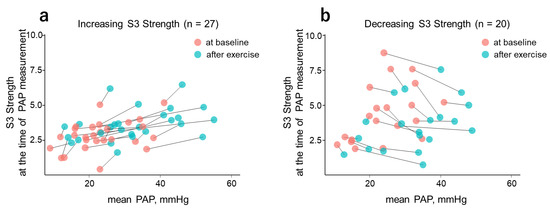 Scatter plot of mean PAP vs. S3 Strength at the time of PAP measurement. With the exercise-induced increase in mean PAP, S3 Strength showed increasing (a) and decreasing (b) tendencies. Light pink and blue circles represent measurement data at baseline and after exercise, respectively. S3, third heart sound; PAP, pulmonary artery pressure.