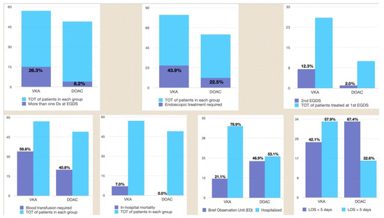 Outcomes of comparison of VKA vs. DOAC in severity of upper gastrointestinal bleeding: more than one diagnosis (top, left); need of endoscopic treatment (top, center); need to rescope (top, right); blood transfusion requirement (down, first graph); management in Brief Observation Unit (Emergency Department, down, second graph) or hospitalization (down, third graph); Length-of-stay of more than five days (down, fourth graph). List of abbreviations: Total (TOT); Vitamin-K antagonists (VKA); Direct oral anticoagulants (DOAC); Diagnosis (Dx); oesofagogastroduodenoscopy (EGDS); Emergency Department (ED); Length-of-stay (LOS).