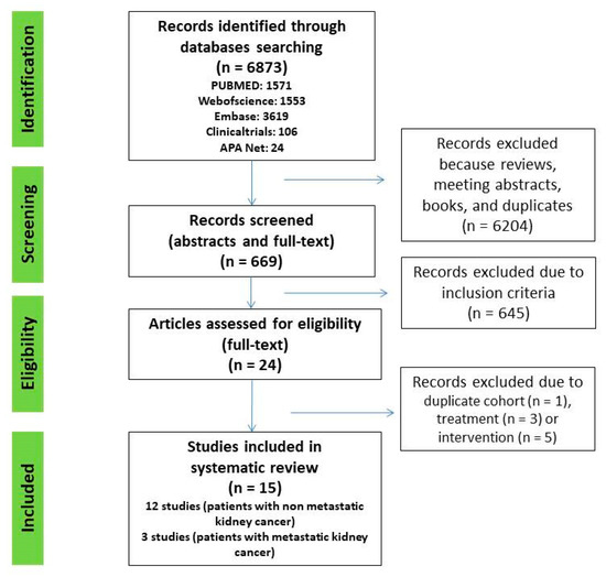 A total of 6873 abstracts and titles were initially identified in all five databases. After removal of reviews, meeting abstracts, books, and duplicates, 669 remained. Then, 645 articles were excluded after screening titles and abstracts. We assessed 24 full text articles and, finally, 15 studies were included (Figure 1).