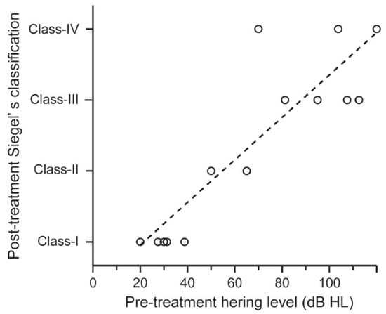 After the first report of COVID-19 cases in China, we retrieved articles comprising 18 patients who developed sensorineural hearing loss associated with COVID-19 (searched on January 19, 2022) [,,,,,,,,,,,,,]. Eighteen patients (10 men and 8 women) with a mean age of 45 years (18–68 years), were included (Table 2). Hearing loss was unilateral in 13 patients (72.2%) and bilateral in five patients (28.8%), and accompanied by symptoms such as tinnitus, dizziness, and facial palsy. The degree of sensorineural hearing loss ranged from mild to severe, showing various patterns of audiograms, such as flat-type, low-frequency type, and high-frequency type. Their hearing thresholds were confirmed by auditory brainstem response in nine patients. Distortion product otoacoustic emissions were absent in all nine patients examined, suggesting that sensorineural hearing loss is of the cochlear origin. MRI was performed in 11 patients, of which four patients demonstrated the following (Table 3): A 60-year-old man showed increased contrast in the right cochlea on T1 post-contrast sequence and partially decreased fluid signal in the basal turn of the right cochlea on T2 sequence, suggesting cochlear inflammation []: A 62-year-old woman exhibiting hearing loss and facial palsy showed enhancement of left seventh and eighth nerves on T1 post-contrast sequence, indicating inflammation of the nerves []: An 18-year-old woman presented high intensity in the left cochlea, vestibule, lateral, and superior semicircular canals on both FLAIR and T1 sequences without enhancement on T1 post-contrast sequence, indicating hemorrhagic lesion in these tissues []: An 84-year-old man demonstrated high intensity in the right cochlea, vestibule, and semicircular canals on both FLAIR and diffusion-weighted sequences with normal intensity on T1 sequences, indicating inflammation of these tissues []. Thus, MRI findings suggest that sensorineural hearing loss associated with COVID-19 is mainly of the cochlear origin through inflammation. We analyzed hearing prognosis in 14 ears from 12 patients for whom hearing thresholds could be evaluated before and after corticosteroid therapy. The prognosis was classified according to Siegel’s classification: Class-I (complete recovery), final averaged hearing threshold ≤ 25 dB regardless of hearing gain; Class-II (partial recovery), final averaged hearing threshold between 25 dB and 45 dB with hearing gain ≥ 15 dB; Class III (slight recovery), final averaged hearing threshold > 45 dB with hearing gain ≥ 15 dB; Class IV (no improvement), final averaged hearing threshold > 25 dB with hearing gain < 15 dB []. We defined Class-I as cured, Class-II and Class-III as improved, and Class-IV as unchanged; based on this criterion, five ears were cured, six ears were improved, and three ears were unchanged (Table 3). Their average pre-treatment hearing thresholds were associated with their hearing prognoses, which showed upward trend from Class-I to Class-IV group with a statistically significant difference (Figure 1, linear regression analysis, R = 0.88, p < 0.001).