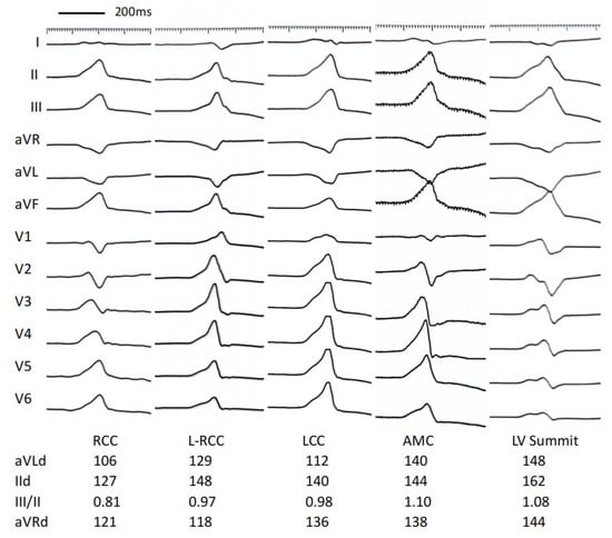 - Igarashi, M.; Nogami, A.; Sekiguchi, Y.; Kuroki, K.; Yamasaki, H.; Machino, T.; Yui, Y.; Ogawa, K.; Talib, A.K.; Murakoshi, N.; et al. The QRS morphology pattern in V5R is a novel and simple parameter for differentiating the origin of idiopathic outflow tract ventricular arrhythmias. Europace 2015, 17, 1107–1116. [Google Scholar] [CrossRef]