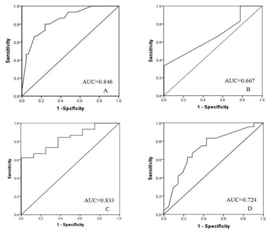 Receiver operating characteristic (ROC) curve of the QS duration in aVL (A), the R duration in II (B), the ratio of III/II (C) and the QS duration in aVR (D) to distinguish LVOT VAs.