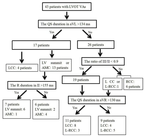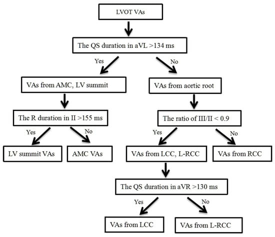 This study explored the surface ECG characteristics of VAs originating from LVOT and we present a simple four-stepwise ECG algorithm to differentiate VAs from different sites of LVOT. We have demonstrated that in patients with VAs when ECG strongly favors an LVOT origin, our four-stepwise ECG algorithm can help localize the likely sites of origin during planning for VAs ablation. First, AMC and LV summit VAs can be differentiated from aortic root VAs by measuring the QS duration in aVL. Then, differentiation between AMC and LV summit VAs can be made by the R duration in II. Third, the ratio of III/II was used to distinguish VAs from RCC and VAs from LCC, L-RCC. Last, LCC VAs could be differentiated from L-RCC VAs by using the QS duration in aVR. For patients referred for catheter ablation of LVOT VAs, this simple ECG measurement might be performed to help plan an ablation strategy and to enhance patient counseling with regard to potential outcome, procedure risk associated with mapping and ablation.