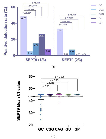 - Zhang, Y.; Hu, X.; Mao, X.; Zhong, G.; Wang, W.; Chen, H. septin 9 gene methylation in gastric carcinoma and its clinical significance. Chin. J. Health Lab. Tec. 2014, 24, 1987–1990. [Google Scholar]