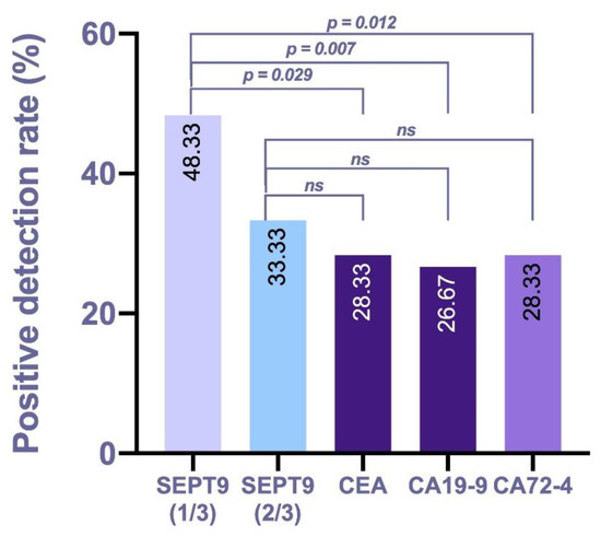 Positive rates of mSEPT9 and serum tumor markers in the GC group. The positive detection rate was compared by McNemer test. ns, not significant.