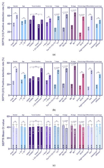 Correlations between mSEPT9 and the clinicopathologic characteristics of the GC group. (a) The 1/3 algorithm was compared by the χ2 test or Fisher’s exact test. GC patients with late T stage (p = 0.041), N stage (p = 0.018), M stage (p = 0.019), and clinical stage (p = 0.019) showed significantly higher mSEPT9 positivity than those in the early stages. (b) The 2/3 algorithm was compared by the χ2 test or Fisher’s exact test. GC patients with late T stage (p = 0.047), N stage (p = 0.035) and M stage (p = 0.008) showed significantly higher mSEPT9 positivity than those in the early stages. (c) The mean Ct value was compared by a t test or an F test. The mean Ct value was associated with N stage (p = 0.002), M stage (p = 0.002), and clinical stage (p = 0.001), but not with the T stage (p = 0.179).