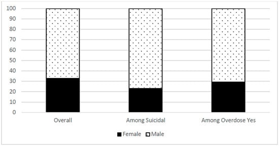 Proportion of Female/Male overall, among those who are suicidal, and among those with an overdose event.