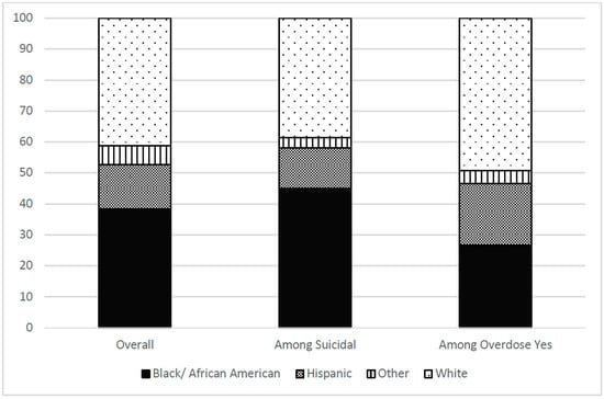Proportion of Race/Ethnicity overall, among those who are suicidal, and among those with an overdose event.