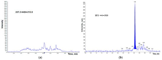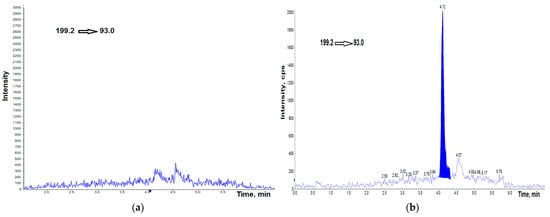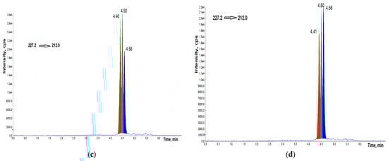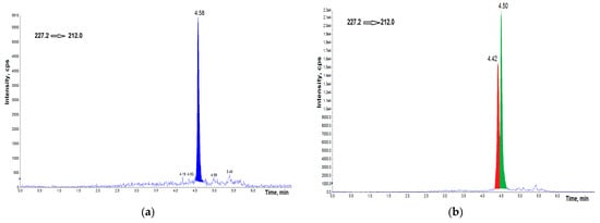 Representative chromatograms obtained by spiking BPA-free, and BPF-free AH by the standards at a concentration of 0.25 ng mL−1 are shown in Figure 1a,b and Figure 2a,b, respectively. Figure 3 shows the chromatogram of the internal standard.