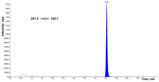 The analytical-method validation was carried out according to the criteria accepted for bioanalytical method validation. The ICH Q2 (R1) method-validation protocols [,] and other requirements [,,] were taken into account. The following validation parameters were determined: selectivity, matrix effect, linearity, limits of detection (LOD) and quantification (LOQ), precision, accuracy, and recovery.