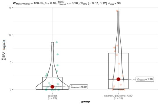 In our study, not even one form of BPA was detected in about 1/3 of the respondents. It is very difficult to indicate the reasons why BPs are detected in some individuals while others do not have them at all. To explain this, it would be necessary to know what the exposure to BPs was or conduct more extensive examinations of the health of patients with the aim of pointing out any metabolic differences between them. In our opinion, this stage of research should be transferred to animal experiments, where it is possible to systematically monitor the BPs’ exposure or the activity of key enzymes. It is worth noticing that the levels of BPA isomers were approximately two times higher in comparison to BPA. Patients undergoing cataract surgery usually suffered from additional diseases such as diabetes, hypertension, glaucoma, and AMD. The BPs detected in AH seem to be only one of the environmental factors contributing to the deterioration of their health. It should be emphasized, however, that patients who, in addition to cataracts, suffered from other ocular diseases such as AMD, and glaucoma, or diabetes had higher mean total levels of BPs. The men’s group was also characterized by elevated total levels of BPs concentration in AH samples in comparison to the women’s group.