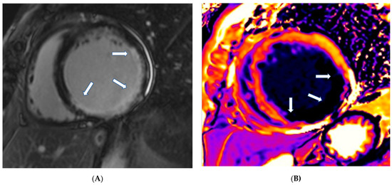 Figure 1. (A) Short-axis LGE image showing myocardial infarction (arrows) in the inferolateral wall of LV. (B) Matching native T1 mapping of the same patient.Myocardial infarction is characterized by subendocardial or transmural LGE in the distribution of epicardial coronary arteries. Subepicardial or patchy LGE usually in the inferolateral wall is characteristic of myocarditis. Finally, diffuse subendocardial LGE that does not follow the typical distribution of epicardial coronary arteries is often associated with microvascular coronary artery disease, vasculitis, antiphospholipid syndrome, and endocrine disorders, such as Cushing syndrome and autoimmune thyroid disease [13]. - (b)