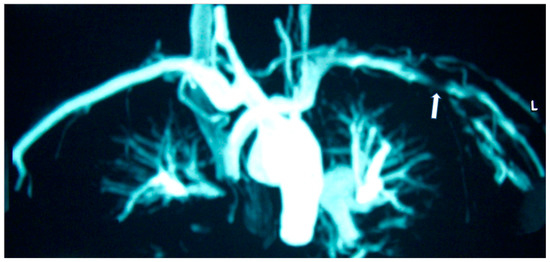 MRA of a patient with Takayasu disease showing left (L) subclavian artery stenosis (arrow).