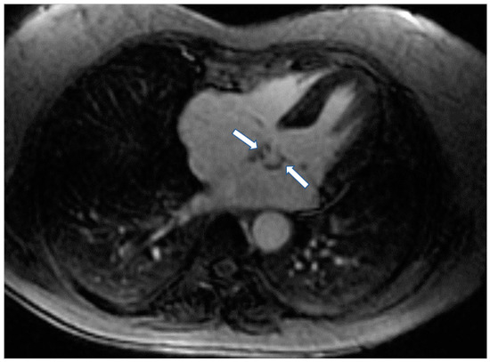 - T1-weighted images (T1-W) and late gadolinium enhancement (LGE): T1-W imaging provides information for a morphological assessment of the heart. Late gadolinium-enhanced T1-W images (LGE), taken 10–15 min after gadolinium-based contrast administrations using inversion recovery pulse sequences, allows for the detection of myocardial replacement fibrosis (scar) (Figure 1) [13]. LGE may also detect marked extracellular interstitial expansion in association with amyloidosis (amyloid deposition and fibrosis) and in pulmonary hypertension (myocardial disarray with increased collagen content without focal replacement fibrosis). In myocarditis, LGE mainly reflects inflammation, combined with or without fibrosis [13]. In the acute phase of myocarditis, LGE correlates with necrosis (associated with edema as assessed by T2 mapping), while in the chronic phase, it corresponds to fibrosis (with less or no edema) [13]. Thrombi (if not organized) do not accumulate contrast agents, making LGE ideal in excluding recent thrombi [14].