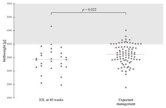 Scatterplot showing the mean birthweight and number of macrosomic newborns in the IOL at 40 weeks and Expectant management groups. Birthweight follows a normal distribution pattern, and data are compared using the t-test for the two independent samples. IOL, induction of labor.