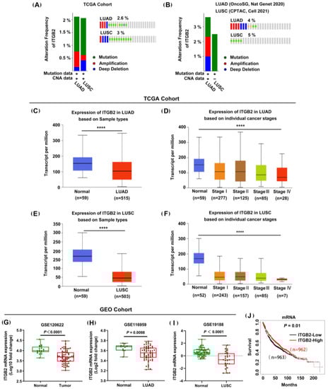 The gene expression and RNA sequencing data of NSCLC were assessed from the TCGA (https://portal.gdc.cancer.gov/ (accessed on 1 May 2022) and Gene Expression Omnibus (GEO) databases (https://www.ncbi.nlm.nih.gov/geo/ (accessed on 1 May 2022). In total, 4 cohorts were collected, including TCGA-LUAD and LUSC, GSE120622, GSE116959, and GSE19188, composed of early stage and advanced-stage patients. The mRNA expression profiles of 99 lung cancer cell lines in the Cancer Cell Line Encyclopedia (CCLE) (https://sites.broadinstitute.org/ccle (accessed on 1 May 2022) were downloaded for the analysis. The cBio Cancer Genomics Portal (c-BioPortal) (http://cbioportal.org (accessed on 1 May 2022) includes a multidimensional cancer genomics dataset []. Therefore, the c-BioPortal database was applied to explore ITGB2 genomic alterations in LUAD and LUSC.