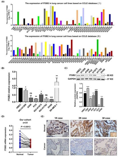 3.2. ITGB2 Expression Was Downregulated in NSCLC Cell Lines and Tissues
