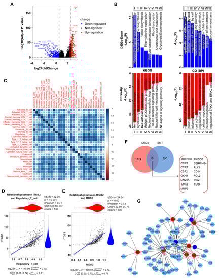 The aberrant expression of ITGB2 in NSCLC is associated with immune cell infiltration and EMT. (A) Four hundred and eighteen upregulated genes and six hundred and seventy−one downregulated genes were identified in the high-expression ITGB2 group based on the TCGA database. (B) GO (BP) and KEGG enrichment annotation of the DEGs in the high−expression ITGB2 group vs. low−expression ITGB2 group. (C) Analysis of the correlations between the aberrant expression of ITGB2 and immune cell infiltration in NSCLC. (D,E) The positive correlation between ITGB2 and Treg cells (D) and MDSC (E). (F) Venn diagram analysis of EMT−related genes in DEGs. (G) Protein−protein interaction (PPI) network constructed with the DEGs. Red nodes represent upregulated EMT−related genes, and blue nodes represent downregulated EMT−related genes.
