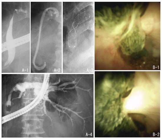 Case 2. The patient had a stenosis of the left hepatic duct after the right hepatectomy (A-1). There were multiple stones upstream of the stenosis (B-1,B-2). The stones were removed by electrohydraulic shockwave lithotripsy under oral cholangioscopy. However, the stenosis was not dilated by the plastic stent (A-2); hence, a self-expandable metallic stent was placed (A-3). One month later, the stent was removed, and cholangiography showed improvement of the stenosis (A-4).