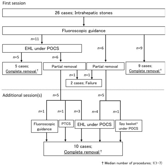In conclusion, endoscopic treatment for intrahepatic stones should be performed at established centers, because specialized devices such as a cholangioscope may be required and cholangitis may increase. POCS may increase the procedure time, but it is useful in the treatment of intrahepatic stones.
