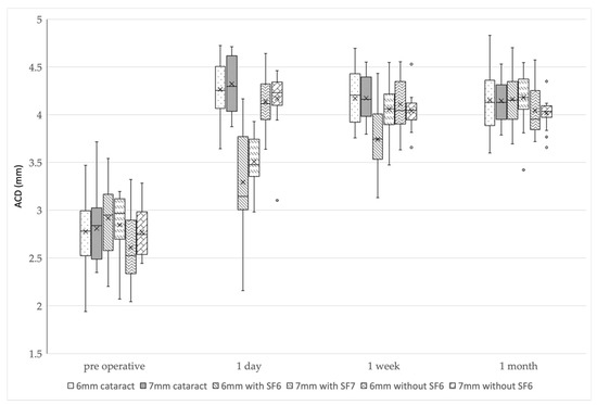 The ACDs at 1 day postoperatively were significantly larger in all the groups compared to the preoperative ACDs (p < 0.01). The mean ACDs in the 6 mm IOL cataract surgery-alone group were 2.78 ± 0.39 mm preoperatively, 4.27 ± 0.27 mm at 1 day postoperatively, 4.17 ± 0.28 mm at 1 week postoperatively, and 4.15 ± 0.30 mm at 1 month postoperatively, whereas in the 7 mm IOL cataract surgery-alone group, the ACDs were 2.80 ± 0.28, 4.33 ± 0.28, 4.17 ± 0.20, and 4.14 ± 0.21 mm, respectively. In the 6 mm IOL with SF6 group, the ACDs were 2.92 ± 0.40, 3.29 ± 0.49, 3.74 ± 0.36, and 4.16 ± 0.31 mm, respectively. In the 7 mm IOL with SF6 group, the ACDs were 2.85 ± 0.33, 3.51 ± 0.26, 4.06 ± 0.25, and 4.18 ± 0.27 mm, respectively. In the 6 mm IOL without SF6 group, the ACDs were 2.61 ± 0.36, 4.14 ± 0.27, 4.10 ± 0.29, and 4.04 ± 0.26 mm, respectively. In the 7 mm IOL without SF6 group, the ACDs were 2.77 ± 0.24, 4.17 ± 0.28, 4.04 ± 0.17, and 4.02 ± 0.14 mm, respectively.