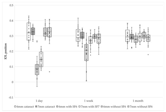In multiple comparisons, the IOL positions of three groups (i.e., 6 mm IOL cataract surgery-alone group, and 6 and 7 mm IOL without SF6 groups) were smaller at 1 week postoperatively than at 1 day postoperatively (p < 0.017 after Bonferroni correction); however, there was no difference between 1 week and 1 month postoperatively (p = 0.18, 0.11, and 0.14 after Bonferroni correction). In the 7 mm IOL cataract surgery-alone group, the IOL position was significantly smaller at 1 week postoperatively than at 1 day postoperatively (p < 0.017 after Bonferroni correction), and significantly smaller at 1 month postoperatively than at 1 week postoperatively (p < 0.017 after Bonferroni correction). In the 6 and 7 mm IOL with SF6 groups, the IOL positions were smallest at 1 day postoperatively, significantly larger at 1 week postoperatively than at 1 day postoperatively (p < 0.017 after Bonferroni correction), and significantly larger at 1 month postoperatively than at 1 week postoperatively (p < 0.017 after Bonferroni correction).