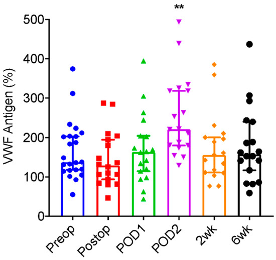 - Mazur, P.; Plicner, D.; Zdziarska, J.; Sadowski, J.; Undas, A. Decreased von Willebrand factor ristocetin cofactor activity and increased ADAMTS13 antigen increase postoperative drainage after coronary artery bypass grafting. Eur. J. Cardiothorac. Surg. 2014, 45, e26–e32. [Google Scholar] [CrossRef] [PubMed][Green Version]