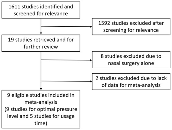 The studies selected in this review were original articles investigating PAP therapy (optimal pressure levels and/or compliance) before and after pharyngeal OSA surgery, regardless of the study design, which included randomized controlled trials, prospective (non-randomized), and retrospective studies. Studies in which pharyngeal OSA surgery with or without nasal surgery was performed were included. However, studies in which nasal surgery alone was performed were excluded. In addition, studies were excluded if PAP therapy data, such as optimal pressure and/or compliance, were not clearly provided before and after surgery or if they lacked the data necessary for meta-analysis. Pharyngeal OSA surgery included tonsillectomy, UPPP and its variants, Pillar implants, tongue base surgery and its variants, genioglossus advancement, and radiofrequency ablation.