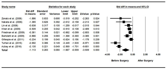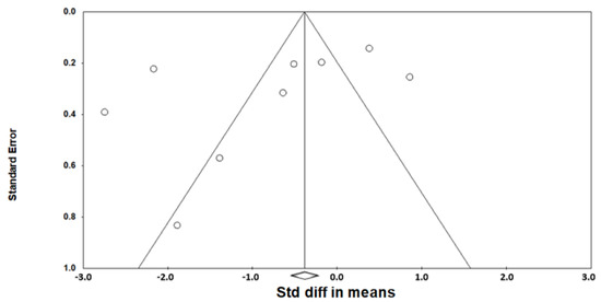 As heterogeneity was present among the studies (Q-value, 28.7; p < 0.001; I2, 86.1), a random-effects model was used. Figure 2 shows the forest plot for the effects of pharyngeal OSA surgery on optimal PAP levels. The summed optimal PAP level was significantly lower after pharyngeal OSA surgery than before surgery (standardized mean difference (SMD), −1.113; 95% CI, −1.667 to −0.559) [26,27,28,29,30,31,32,33,34]. Although the funnel plot looks slightly asymmetrical, we thought there was no publication bias because the Egger test p-value was 0.182 (Figure 3).