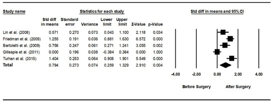 Forest plot for the effects of pharyngeal obstructive sleep apnea surgery on positive airway pressure usage time. The summed usage time of PAP increased significantly after pharyngeal OSA surgery compared to before surgery. Std diff, standardized difference; CI, confidence interval [28,30,31,32,33].