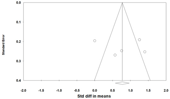 As heterogeneity was present among the studies (Q-value, 28.7; p < 0.001; I2, 86.1), a random-effects model was used. Figure 4 shows the forest plot for the effects of pharyngeal OSA surgery on usage time. The summed usage time of PAP increased significantly after pharyngeal OSA surgery compared to before surgery (SMD, 0.794; 95% CI, 0.259 to 1.329) [28,31,32,33]. The funnel plot looks symmetrical, and the Egger test p-value was 0.792, indicating no publication bias (Figure 5).