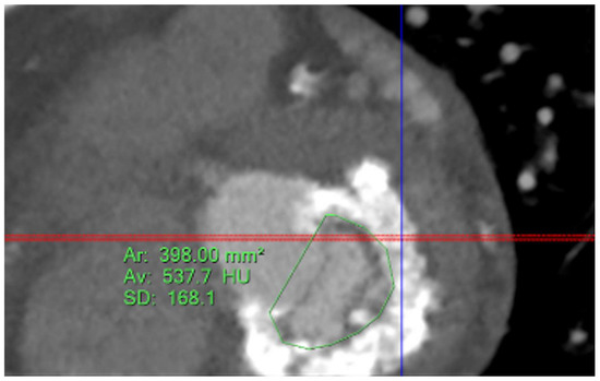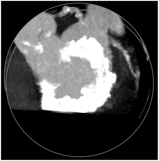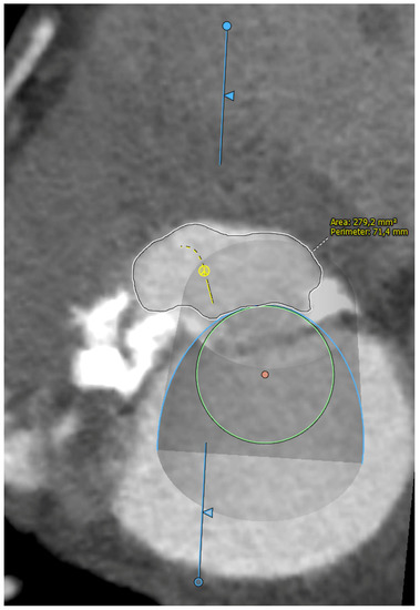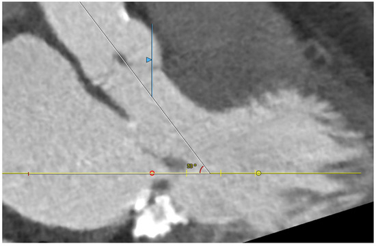 Five observational studies have been published since 2017 exploring the safety and efficacy of ViMAC, all of them with aortic balloon-expandable bioprosthesis in prohibitive surgical risk patients [17,18,19,20,21]. Their designs and main results are summarized in Table 1. To note, the ViMAC procedure shows worse results in terms of technical success and short- and mid-term outcomes than those of ViV and ViR. Indeed, ViMAC is the most challenging percutaneous scenario of all types of TMVR. Mortality at the one-year follow-up is high (around 50%), underscoring the importance of patient selection and of performing these interventions in experienced centers. When comparing the three approaches of TMVR for ViMAC, transatrial appears to have the best results, with one-year rates of mortality at 35% (25% in the latest series) [16,22,23], compared to those of transapical (57%) and transseptal (63%), and higher technical success rates (89% vs. 71% and 65%, respectively). The most important adverse event is the obstruction of the LVOT, with a hazard ratio for mortality of 2.87 (95% confidence interval 1.66–4.96) [19], so this must always be anticipated by a preprocedural CT. An area below 170 mm2 in the LVOT once the valve is implanted (“neo-LVOT”) is highly predictive of this complication (Figure 6) [13]. Other important CT parameters include the angle between the aorta and the LV axis (Figure 7), mitral annulus dimensions (Figure 8), and 2D- or 3D-derived virtual reconstructions (Figure 6).