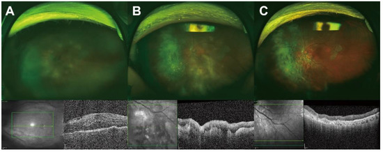 The mean initial best-corrected visual acuity was 0.8 ± 0.9 logMAR (0.2 ± 0.1; Snellen equivalent visual acuity), and the mean intraocular pressure was 13.4 ± 3.9 mmHg. Inflammatory cells were observed in the anterior chamber in 44.7% of the patients (grade: 1.4 ± 1.3 (Standardization of Uveitis Nomenclature)). Vitreous cells or haziness were observed in 97.4% of patients, whereas retinal pigment epithelium infiltration and retinal hemorrhage were observed in 65.8% (n = 25) and 21.1% (n = 8) of patients, respectively (Figure 1, Table 2).