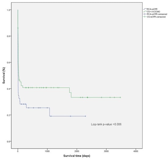 Cardiac arrest is an extreme form of CS, and it is often difficult to distinguish between CS being cannulated for VA ECMO and RCA patients who require eCPR. Because of the different baseline characteristics according to treatment strategy [], these two groups were evaluated separately.