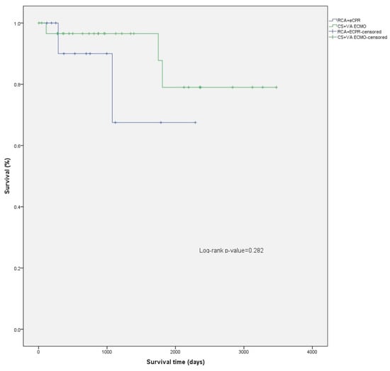 The median follow-up time was 969 days (IQR 500–2192) (2.7, IQR 1.4–6.0 years) for the patients studied, 1128 days (IQR 500–2355) (3.1, IQR 2.7–6.5 years) for the CS patients, and 752 days (IQR 369–1122) (2.1, IQR 1.01–3.1 years) for the RCA patients. (Figure 1) For patients discharged alive from the hospital, mean survival was 2943 days (95% CI: 2521–3364) (8.1, 95% CI 6.9–9.2 years), 3060 days (95% CI: 2636–3485) (8.4, 7.2–9.5 years) for the CS patients, and 1817 days (95% CI: 1256–2378) (5.0, 95% CI 3.4–6.5 years) for the RCA patients. The difference in survival from hospital discharge was not statistically significant (log-rank p = 0.282) (Figure 2). The difference in survival persisted even after adjusting the survival curves for possible cofounders (Figure A1, Table A3, Figure A2, Table A4). Mortality in the first 30 days after ECMO implantation was high: 56.8% overall, 51.4% for CS, and 65.2% for RCA patients.