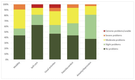 The EQ-5D-5L assesses five dimensions of health, namely mobility, self-care, usual activities, pain/discomfort, and anxiety/depression, with five severity levels: no problems, slight problems, moderate problems, severe problems, and unable to perform a task. The visual analog scale (EQ-VAS) is a constituent part of the questionnaire and provides a quantitative measure of the patient’s general perception of health on a scale of 0 to 100 [].