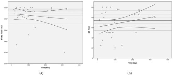 No significant association was observed between length of follow-up and either EQ-5D-5L index value or EQ-VAS (r (32) = −0.14, p = 0.225 and r (32) = 0.23, p = 0.108, respectively). The distributions of EQ-5D-5L index values and EQ-VAS over time are shown in Figure 4.
