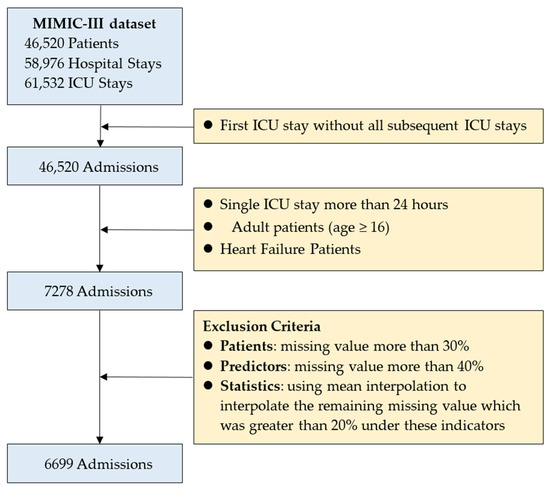 For this study, in order to prevent possible information leakage and ensure a similar experimental setting compared to the related work, we used only the first ICU admission data for each patient. To emphasize the early predictive value, we used data from the first 24 h of patient admission as input to the predictive model and excluded patients younger than 16 years of age [12,21,26,44,45,46]. A patient cohort was selected based on the following exclusion criteria: The first ICU stay without all subsequent ICU stays, single ICU stay more than 24 h, patients’ first 24 h of ICU admission, and adult patients (age ≥ 16). Patients with discharge diagnosis as HF were screened out based on the International Classification of Diseases, 9th Revision codes (ICD-9) 398.91, 402.01, 402.11, 402.91, 404.01, 404.03, 404.11, 404.13, 404.91, 404.93, 428.xx [47,48,49,50]. After the first stage of data screening, a total of 7278 eligible patients were qualified.