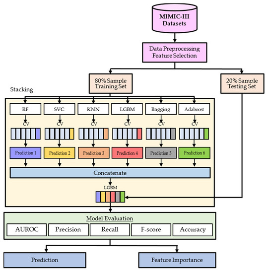 Mortality rate is a major outcome in acute care: ICU mortality is the highest among hospital units (10% to 29%, depending on age and disease), and early identification of high-risk patients is key to improving outcomes [51]. Mortality prediction is one of the primary outcomes of hospitalization. In this paper, we use ICU admission records of HF patients in the MIMIC-III dataset to predict mortality in HF patients at different time points. We propose an ensemble learning model based on stacking. In the first layer of the stacking model we applied six ML methods, including RF, SVC, KNN, LGBM, Bagging and Adaboost to perform a first-level classifier on the dataset. Then, the fusion of these six classifier decisions was used to construct and optimize the stacked set of classifiers. This was followed by subjecting the datasets to second-level classifier using LGBM, and formed the final prediction. Figure 2 shows the Stacking ensemble based on a cross-validation of all feature subsets.