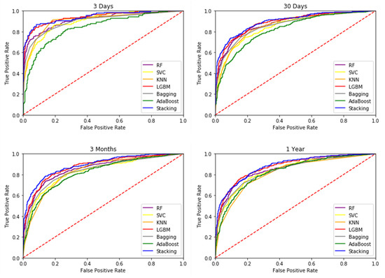 In this study, a 10-fold cross-validated training and testing was used, with 80% of the data used for training the model and 20% for testing the model, followed by extensive statistical analysis to evaluate performance. In this study, data collected within 24 h of admission to the ICU were used to predict the mortality of patients 3 days, 30 days, 3 months and 1 year after admission. The most commonly used metric to assess the performance of diagnostic tools is AUROC, which graphically presents the true positive rate and the false positive rate. Table 4 lists the six different ML methods used in the first phase of this study, and the addition of the Stacking technique in the second phase involved seven techniques to generate the AUROC of HF patient mortality prediction tasks over four different time periods. This study determined the highest AUROC for predicting 3 days mortality in patients with HF, i.e., death within 3 days could be accurately predicted within 24 h of patient admission. Figure 3 and Figure 4 indicate that the data collected from ICU admissions can be used to predict mortality within 3 days, which is a better prediction outcome; Figure 3 also clearly shows that all four models have high AUROC after adding stacking technique in the second stage, which means they can distinguish mortality from non-mortality cases well. Therefore, prediction models constructed in this study, can predict the life and health status of patients more accurately.