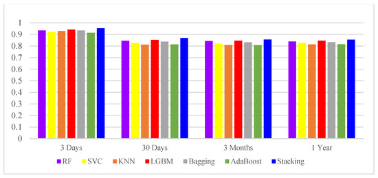 In addition to the above AUROC, this study also compares Precision, Recall, F-score, and Accuracy, as shown in Table 5, when evaluating the performance of different attribute sets used in the classification algorithm. The best precision and recall was shown in a run where the 3 days mortality was used to select the best subset of attributes. In addition, it can be observed from Figure 5 that the addition of Stacking technique in the second stage results in a higher accuracy, with the highest value of 0.9525 for predicting mortality within 3 days. The highest value was 0.9525 for predicting mortality within 3 days. It also demonstrated that this study could achieve very good results in predicting mortality in HF patients using data from 24 h before the patients were admitted to ICU.