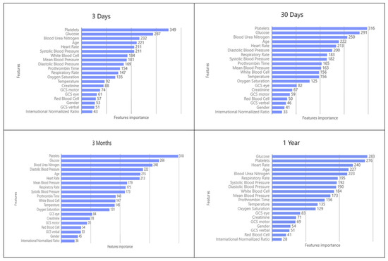 Feature importance is the main contribution of each feature to improve the predictive power of the whole model. It provides an intuitive view of the importance of features to see which features have a greater impact on the final model, but it is not possible to determine how the features relate to the final prediction. Figure 6 lists the different explanatory variables according to their contribution to each model. We can observe that the clinical characteristics of Platelets, Glucose, Blood Urea Nitrogen, Age, Heart Rate, Systolic Blood Pressure, and Diastolic Blood Pressure are important factors influencing the prediction of HF, and previous studies of HF Similar results have been found in previous studies of HF [74,75,76]. However, the effects of GCS eye, GCS motor, GCS verbal, Red Blood Cell, International Normalized Ratio and Gender were not as significant.