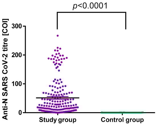Anti-SARS-CoV-2 N protein antibodies titres in the control and study groups.
