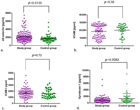 Median concentrations of soluble adhesion molecules and CRP in the study and control groups. There were significant differences in E-selectin and syndecan-1 between the two groups.