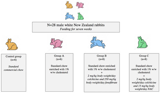 Group B (n = 8) was fed the same hypercholesterolemic diet enriched with 2 mg/kg body weight/day colchicine and 250 mg/kg body weight/day fenofibrate. Lastly, Group C (n = 8) received the same hypercholesterolemic diet plus 2 mg/kg body weight/day colchicine and 15 mg/kg body weight/day NAC. Colchicine, fenofibrate, and NAC were pulverized and, subsequently, dissolved in tap water. Pharmaceuticals were only administered per os to avoid injection-induced stress reactions which could potentially affect the expression of developmental genes [12,21,22,23,24].