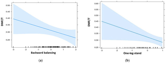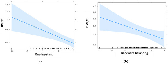 The results of the Poisson regression analysis (Table 4, Figure 2) showed that the DMF/T decreased by a factor of 0.82 when test results were better in the one-leg-stand. (p < 0.001). Caries experience increased with age (exp (ß) ≈ 1.2, p < 0.001), low SES (exp (ß) = 2.31–2.50, p < 0.001), and increased plaque accumulation (exp (ß)fair = 2.16–2.20, p < 0.001; exp (ß)poor = 4.35–4.57, p < 0.001). No significant relation between the coordinative balancing backwards tests and jumping side-to-side and DMF/T could be found. In addition, we found no evidence of association between subjects’ sex and their caries experience. Adjusted for backward balancing, past orthodontic treatment had a significant effect on caries prevalence. For one-leg stand and side-to-side jumps, the significance level was also almost reached.